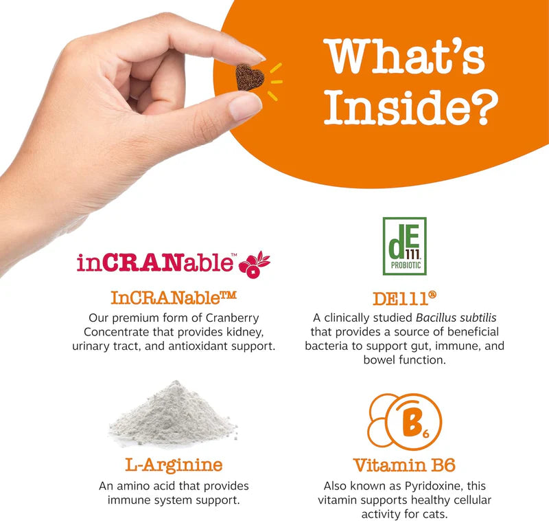 - Made with InCRANable – These chewables contain a premium form of Cranberry Concentrate to provide kidney, urinary tract, and antioxidant support for cats of all ages, breeds, and sizes.